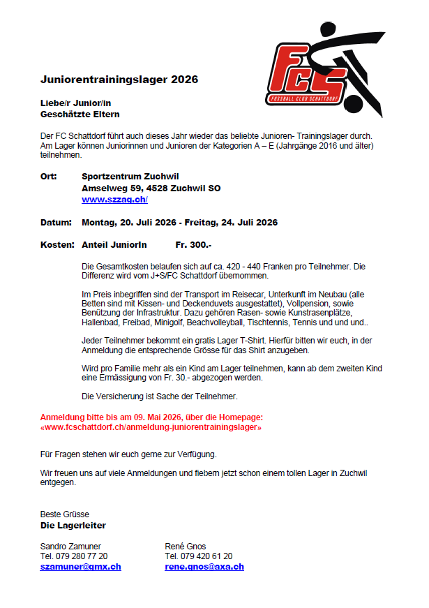20 - 24 Juli 2026 hier anmelden -> Anmeldung Juniorentrainingslager 2026