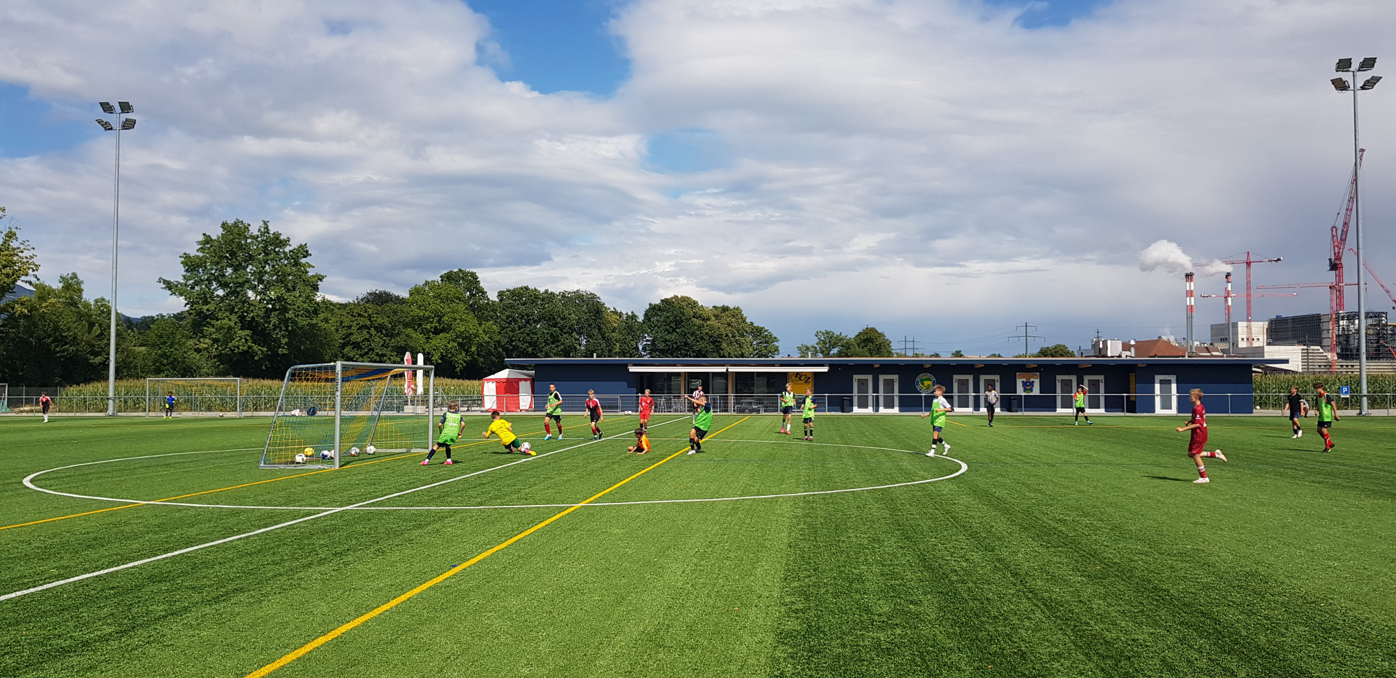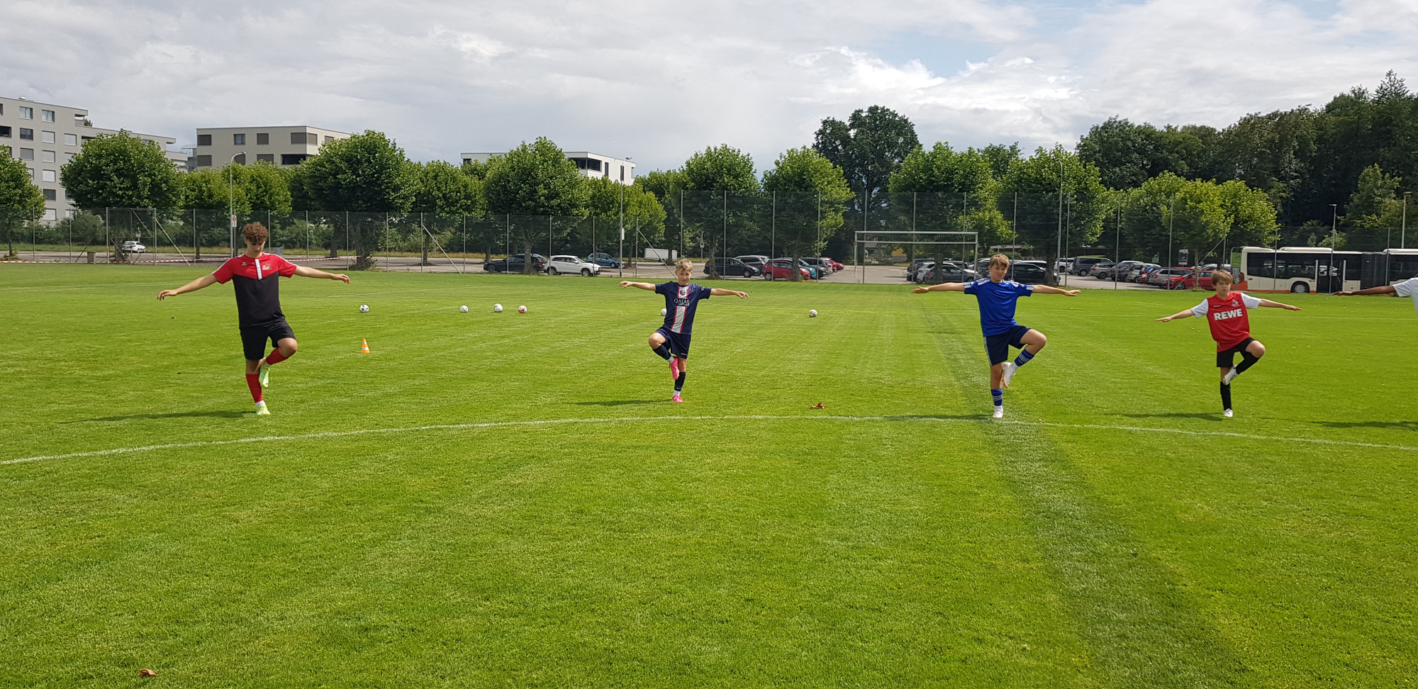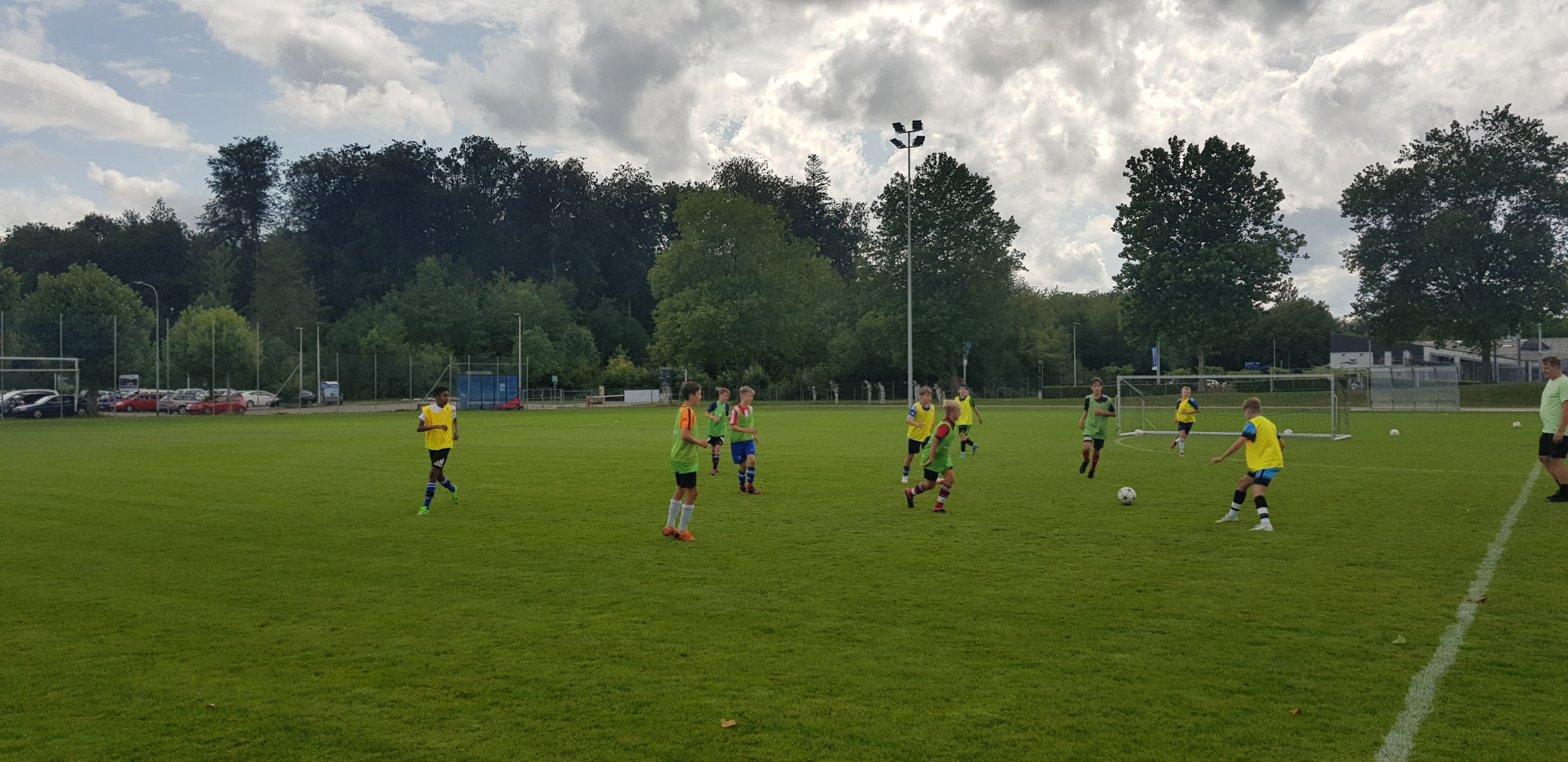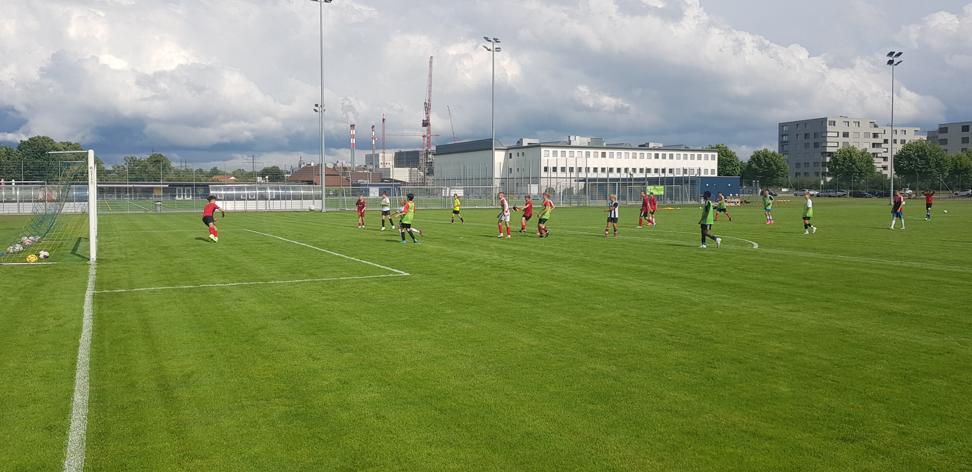 Trotz der trüben Wetteraussichten für die Lagerwoche fanden sich am Montag, 24. Juli 36 bestens gelaunte Junioren und das Leiterteam beim Feuerwehrlokal in Schattorf ein. Bereits hier sah man eine grosse Disziplin und der Tross konnte bereits einige Minuten früher als geplant die Fahrt nach Zuchwil in Angriff nehmen. Kurz nach 09.00 Uhr bereits die Ankunft in Zuchwil. Nach einer kurzen Instruktion hiess es bereits antraben zum ersten Training. Hier zeigte sich zum ersten Mal, dass der Wettergott ein FCS Fan sein muss. Obwohl sich alle auf ein Regentraining einstellten, öffnete Petrus die Pforten erst nach Beendigung des Trainings. Dies wiederholte sich glücklicherweise die ganze Woche. Bis auf eine kurze Ausnahme schüttete es jeweils vor oder dann erst nach dem Training. Nach dem Mittagessen konnten dann die Jungs die neuen, umgebauten Schlafräume beziehen. Neben zwei Massenlager für die Jüngsten, durften sich die älteren in drei 8er Zimmer verteilen.