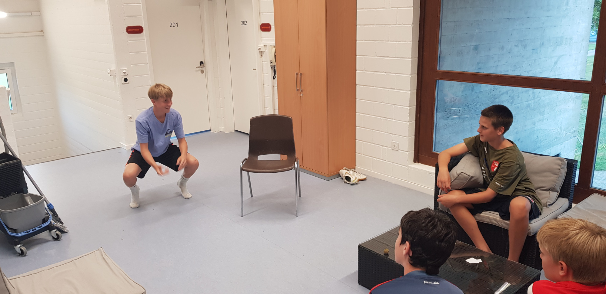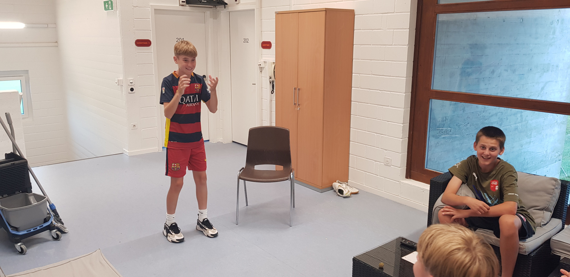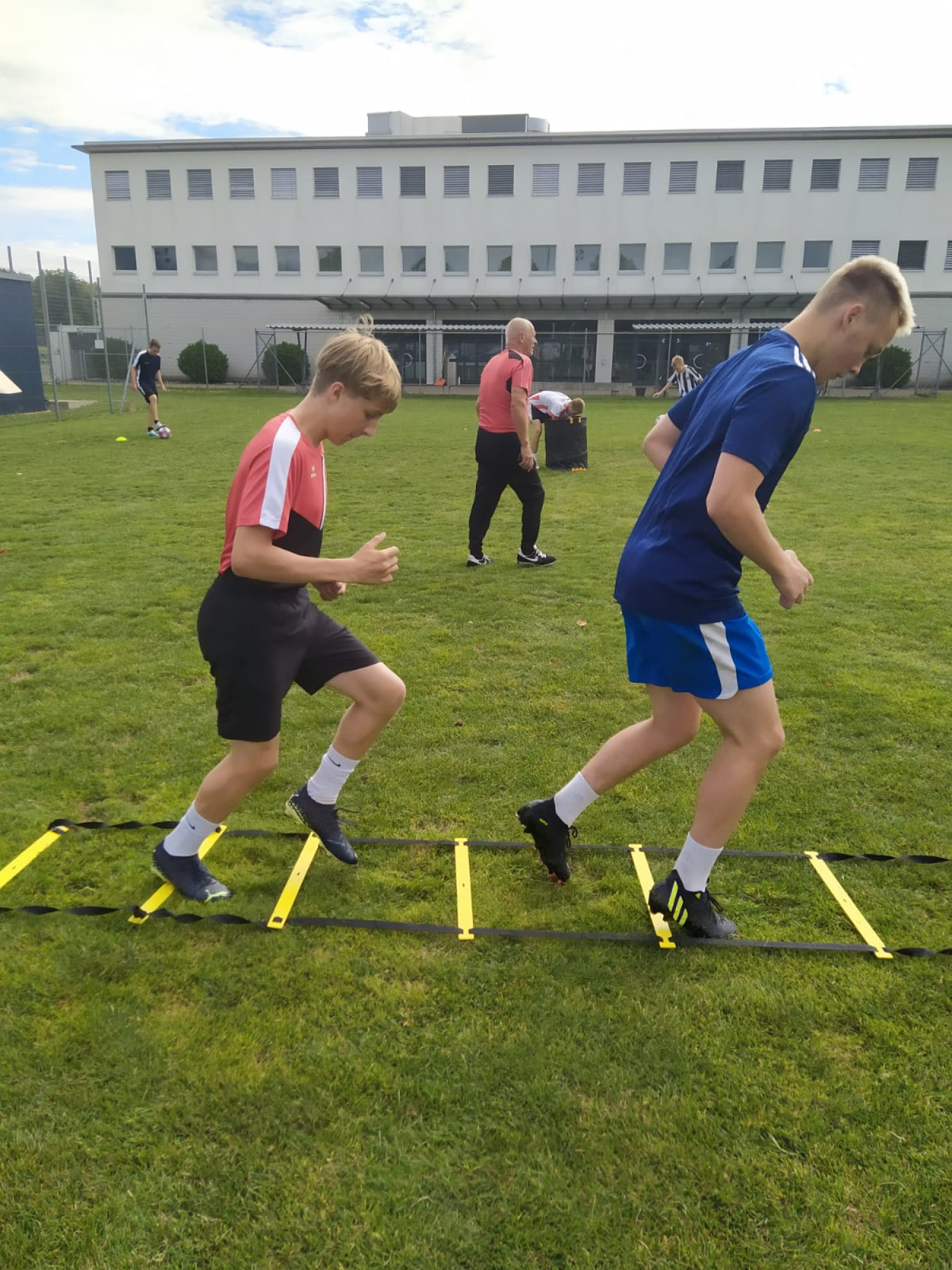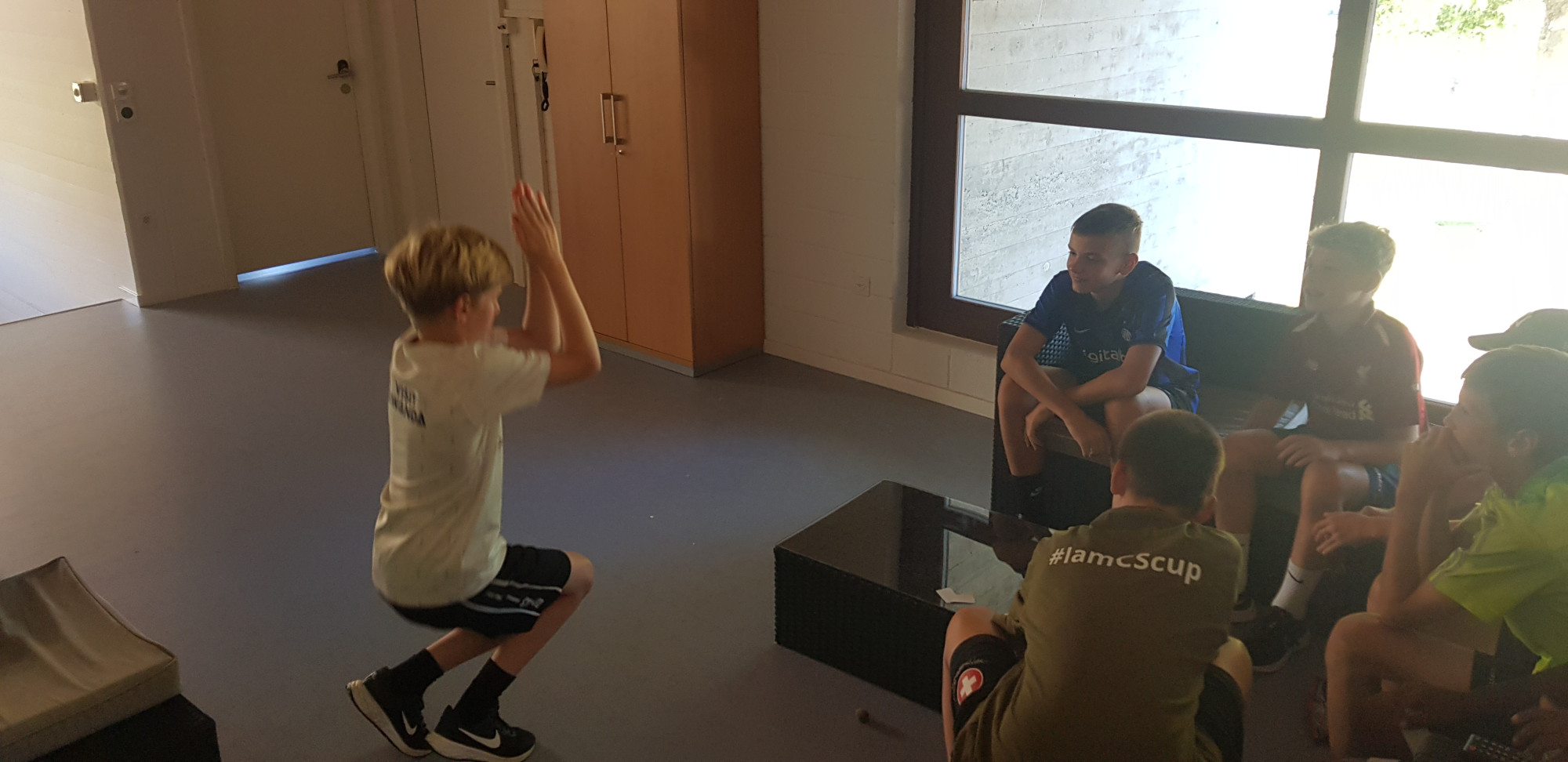 Trotz der trüben Wetteraussichten für die Lagerwoche fanden sich am Montag, 24. Juli 36 bestens gelaunte Junioren und das Leiterteam beim Feuerwehrlokal in Schattorf ein. Bereits hier sah man eine grosse Disziplin und der Tross konnte bereits einige Minuten früher als geplant die Fahrt nach Zuchwil in Angriff nehmen. Kurz nach 09.00 Uhr bereits die Ankunft in Zuchwil. Nach einer kurzen Instruktion hiess es bereits antraben zum ersten Training. Hier zeigte sich zum ersten Mal, dass der Wettergott ein FCS Fan sein muss. Obwohl sich alle auf ein Regentraining einstellten, öffnete Petrus die Pforten erst nach Beendigung des Trainings. Dies wiederholte sich glücklicherweise die ganze Woche. Bis auf eine kurze Ausnahme schüttete es jeweils vor oder dann erst nach dem Training. Nach dem Mittagessen konnten dann die Jungs die neuen, umgebauten Schlafräume beziehen. Neben zwei Massenlager für die Jüngsten, durften sich die älteren in drei 8er Zimmer verteilen.