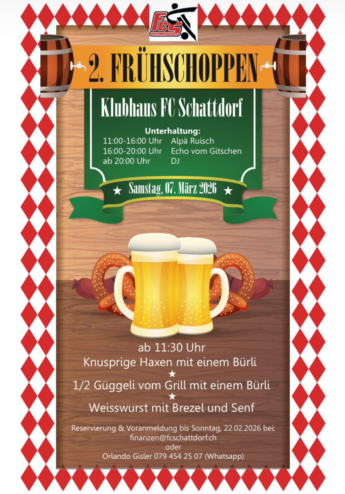Reservierungen & Voranmeldungen bis Sonntag 22.02.2026 bei Diese E-Mail-Adresse ist vor Spambots geschützt! Zur Anzeige muss JavaScript eingeschaltet sein! oder bei Orlando Gisler - 079 454 25 07 (via WhatsApp)